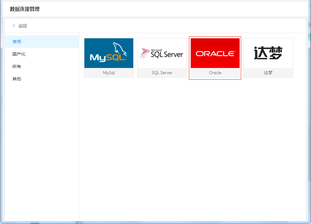 以管理员身份登录门户,进入“应用管理>设计>数据连接管理”界面,点击“+”,在“所有”选项下选择 “Oracle”,如下图所示: