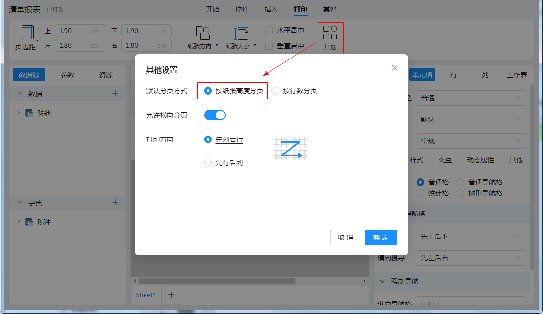 • 分页行数设置多了,内容会超值纸张范围,打印不下。