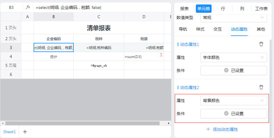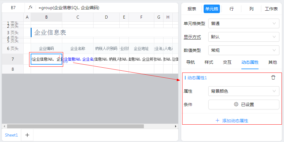 首先,选中需要设置背景色的单元格,进入单元格属性“动态属性”进行配置,如下图:
