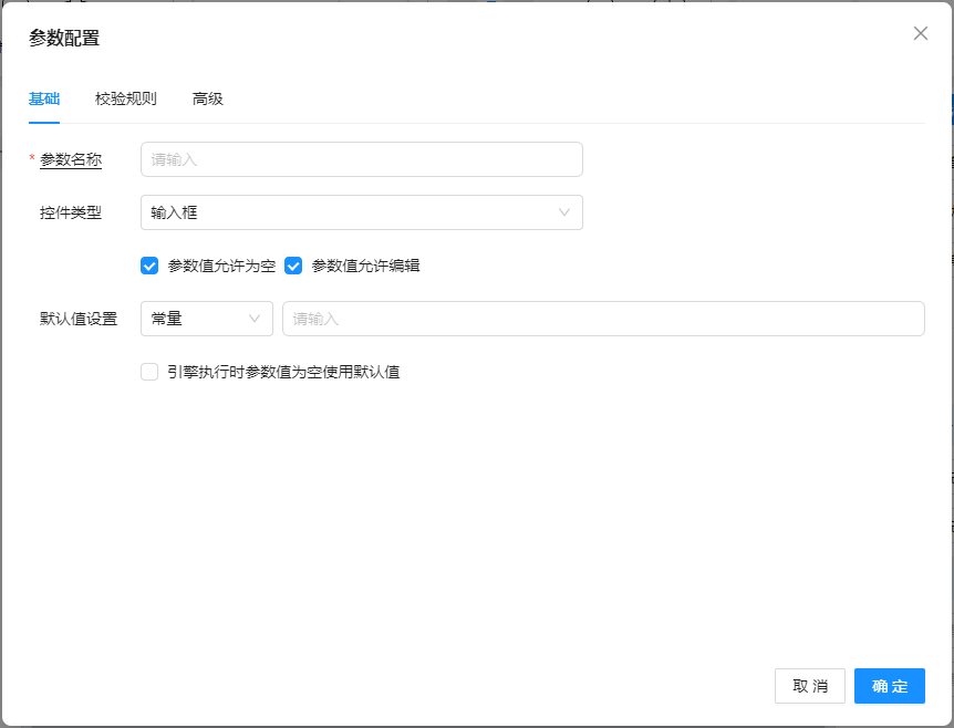 点击[+]按钮将弹出参数设置窗口,公共属性包括:基本、校验规则和高级。如下图: