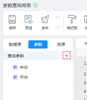 常见的创建方法是在模板设计界面的左侧资源区“参数”Tab下点击[+]按钮,如下图: