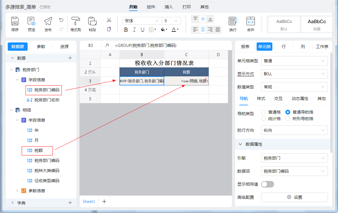 如下图示例,表格中有两个数据源的数据,税务部门来自“bm_swbm”表,税额来自于”ZS_MX”表,它们都有一个共同字段:税务部门编码,也就是说它们的数据之间有关系。