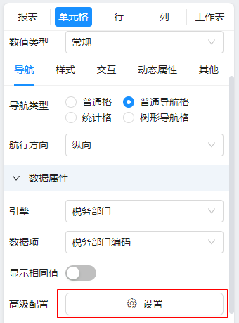 3)过滤条件设置:通过单元格属性的“导航》数据属性》高级配置”的设置按钮: