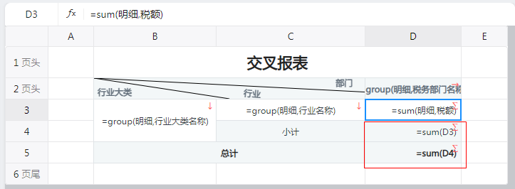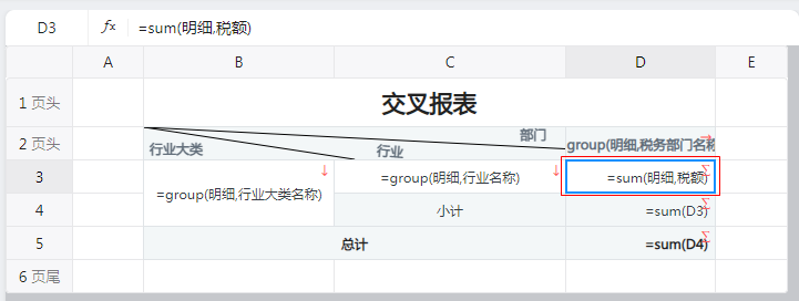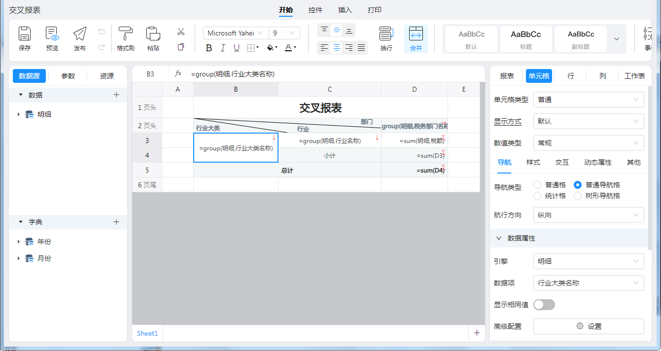将单元格B3和C3均设置为“普通导航格”,航行方向为“纵向”,其中B3用于行业的分组显示,分组功能可参考文档:分组报表。