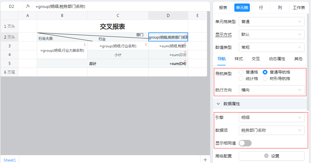 将单元格D2设置为“普通导航格”,航行方向为“横向”,并配置导航内容: