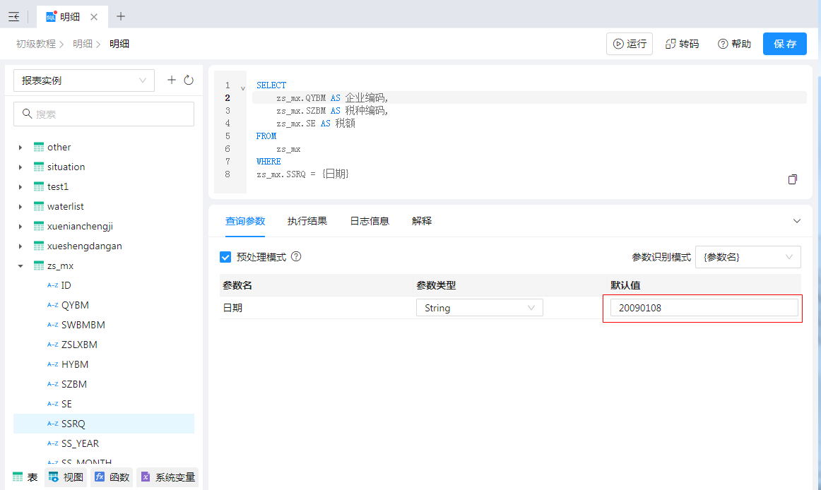 数据视图创建之后,通过 [运行] 查看取出的数据。如下图: