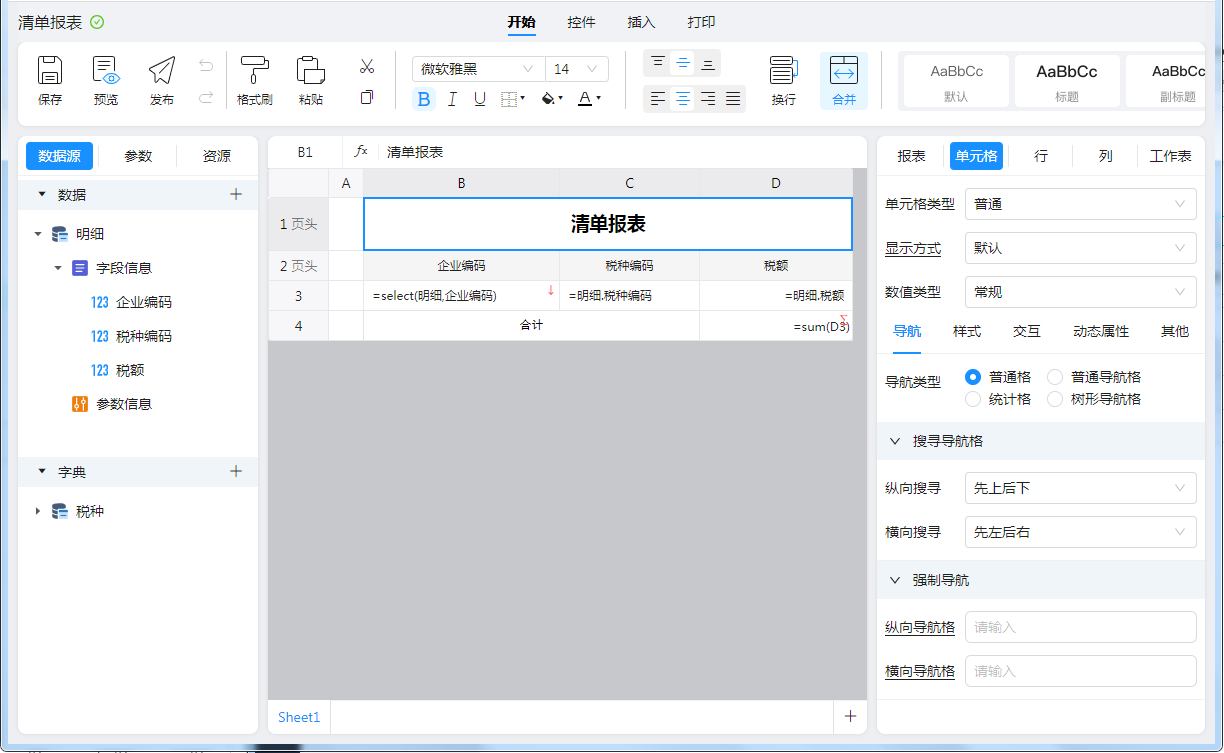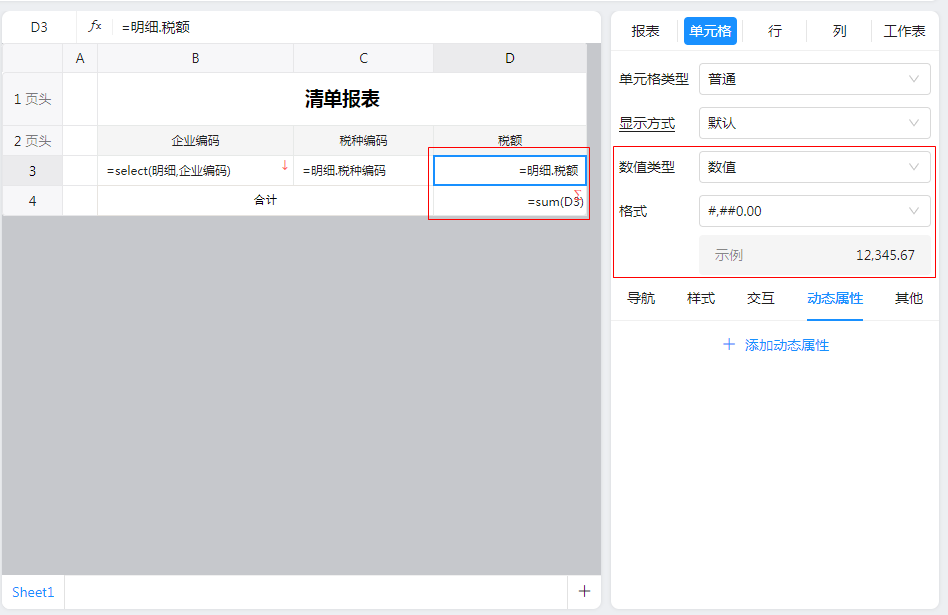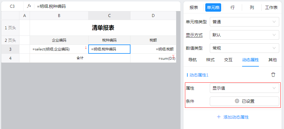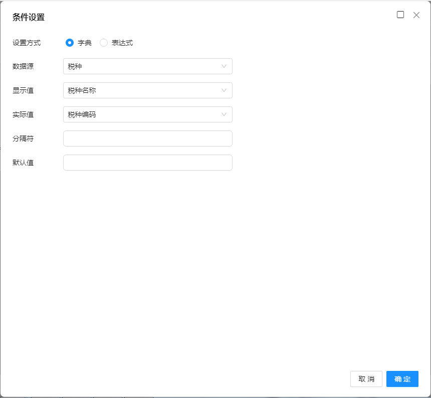 税种显示的是编码,想要显示名称的话,需要通过“动态公式”进行设置,属性选择“显示值”,设置条件选择字典数据源“税种”,配置好编码字段和显示字段即可。