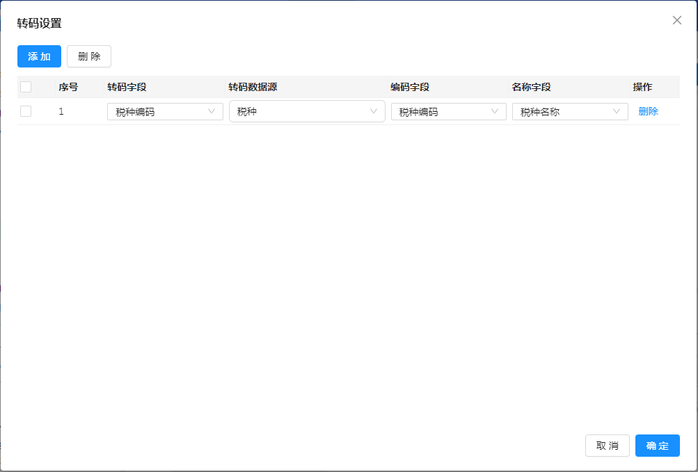 点击数据视图设计界面的“转码”按钮,将弹出转码设置界面,例如,需要“税种编码”进行转码,转码字段选择“税种编码”,设置转码数据源以及编码字段和名称字段即可,如下图: