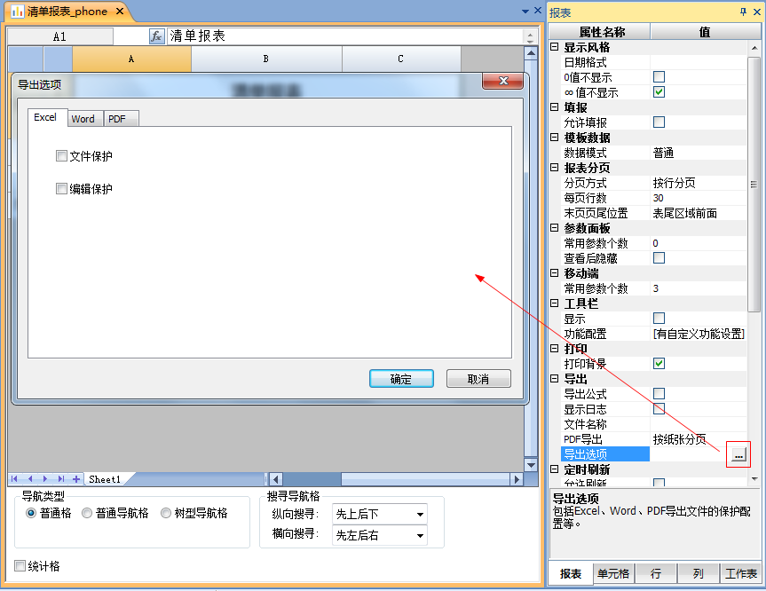 点击设计器模版的“报表”属性中[导出>导出选项],可对不同文件类型进行相关属性配置,如下图: