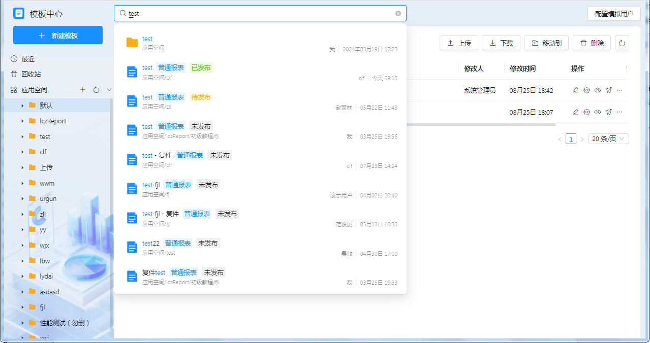 可根据名称搜索当前应用下的文件夹和模板,如下图: