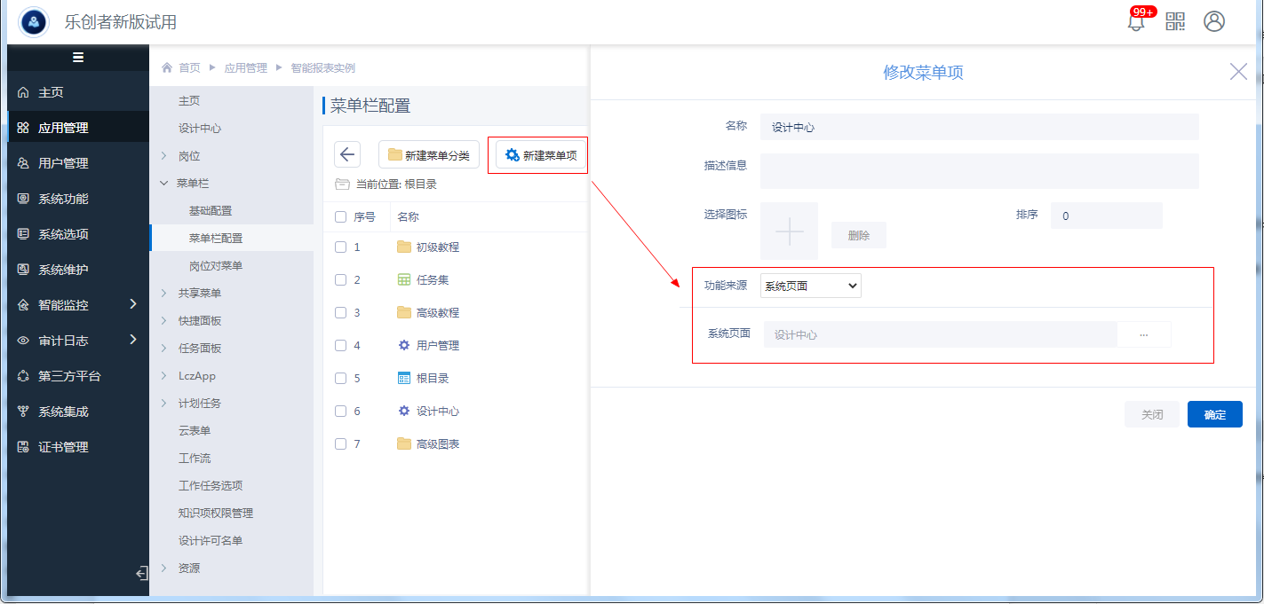 系统管理员进入某应用的设计界面,通过“菜单栏》菜单栏配置”新建菜单项,功能来源选择“系统页面”,选择“其他”中的“设计中心”功能即可。