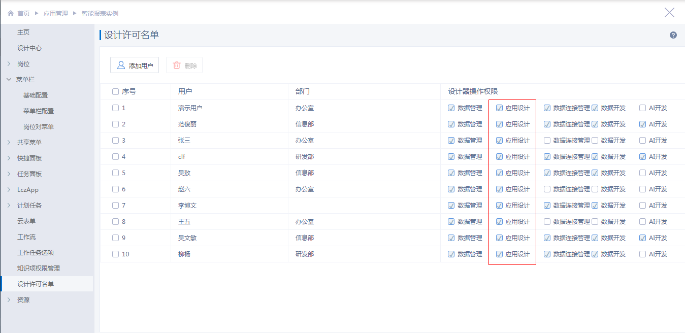 拥有“设计中心”菜单访问权限后,还要拥有“应用设计”权限才能访问“模板中心”,因此,系统管理员还需要进入“设计器许可名单”菜单,添加普通用户并赋予“应用设计”权限。如下图: