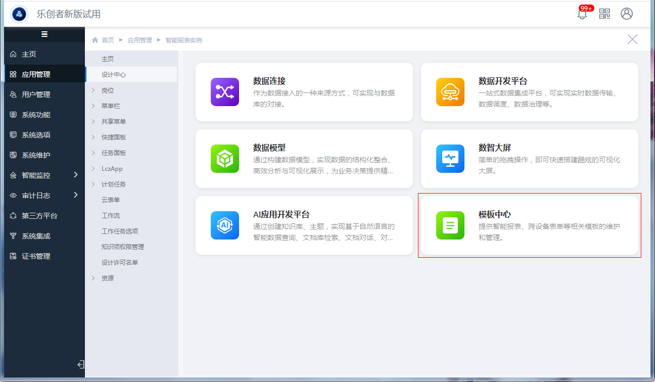 以上步骤操作之后,拥有对应岗位和设计权限的用户即可登录系统,切换到对应应用,会看到“设计中心”菜单,该菜单页面将会有“模板中心”功能入口,如下图: