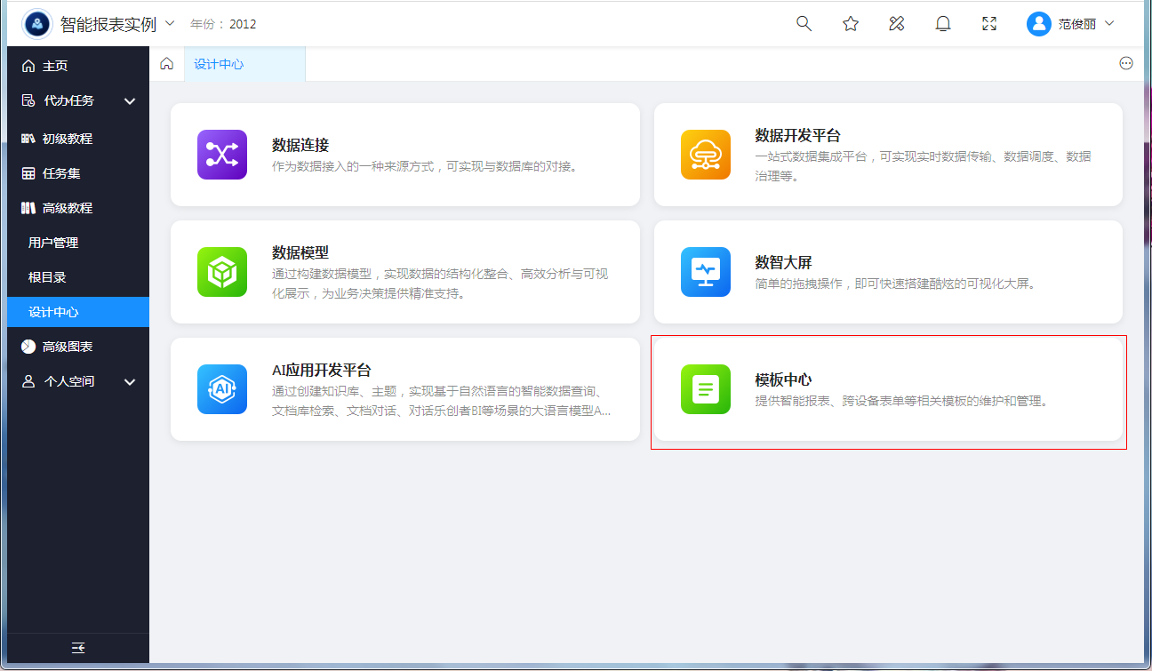 系统管理员、应用管理员和普通用户想要查看或设计报表,需要从“设计中心”菜单通过“模板中心”进入,如下图: