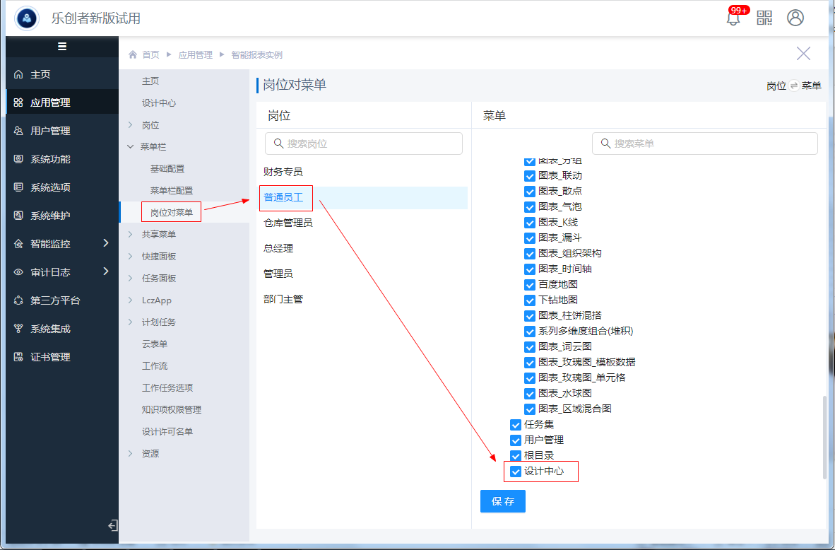 进入“岗位对菜单”通过为岗位分配“设计中心”菜单权限,达到为普通用户分配菜单访问权限的目的。